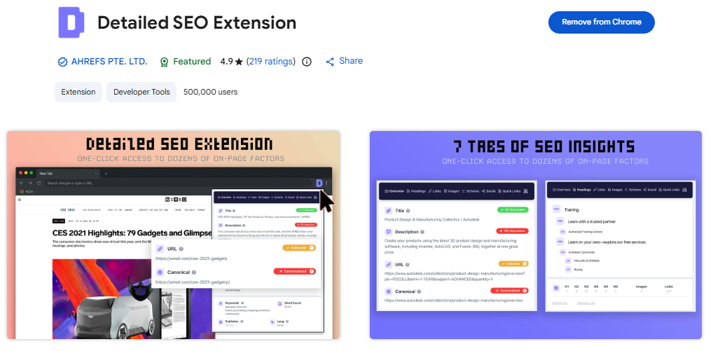Detailed SEO shows meta tags, canonical links, robots directives, structured data, and Open Graph information. It is helpful for checking technical SEO elements quickly.